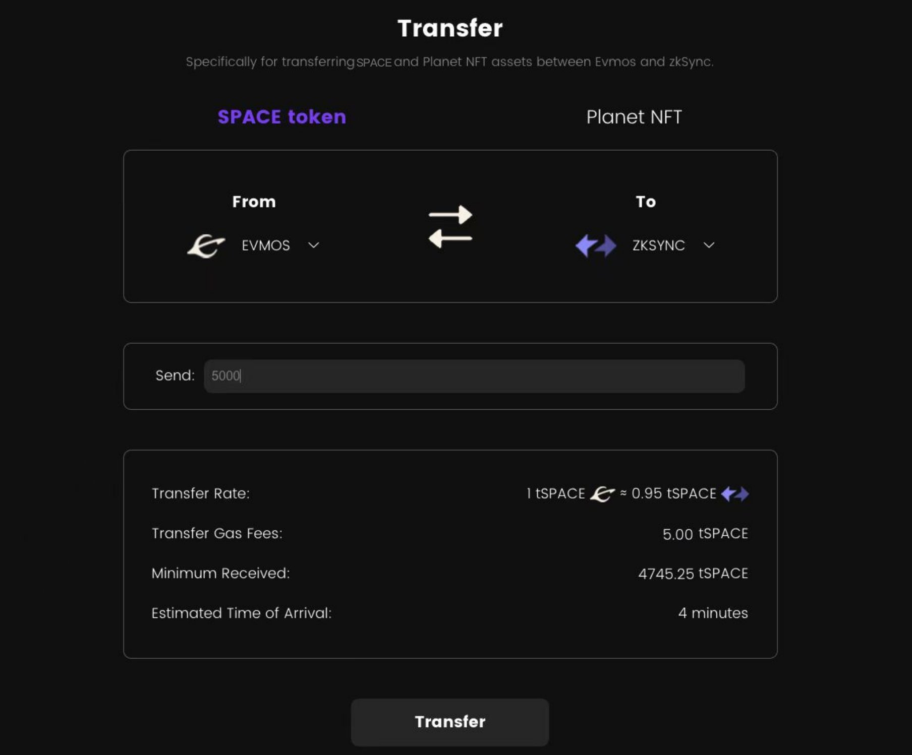 SPACE Bridge is specially designed for transferring SPACE/xSPACE/Planet NFT between different chains, currently Evmos and zkSync Era.